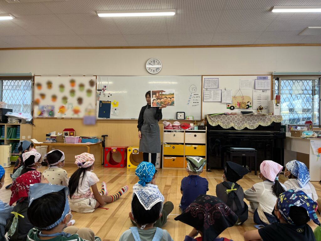 まずは五平餅の由来を紙芝居で読んでもらい、どうして五平餅ができたのかや五平餅の名前の由来などを聞き、子どもだけでなく職員も勉強になりました。