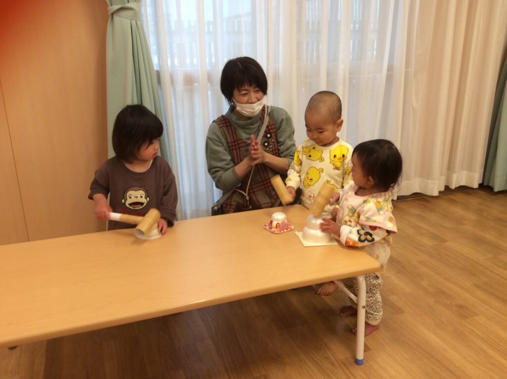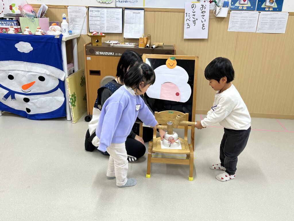 叩くのが楽しく「もう一回、もう一回」と言う子やみんなで「よいしょよいしょ」と言ったりして、鏡開きを楽しむことができました。