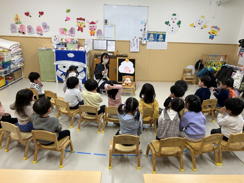 年神様に「感謝の気持ち」や「一年元気に過ごせるように」祈りながらトンカチで鏡餅を叩きました。力一杯叩く子や優しく叩く子など楽しんでいる子どもたちの姿が沢山見られました。